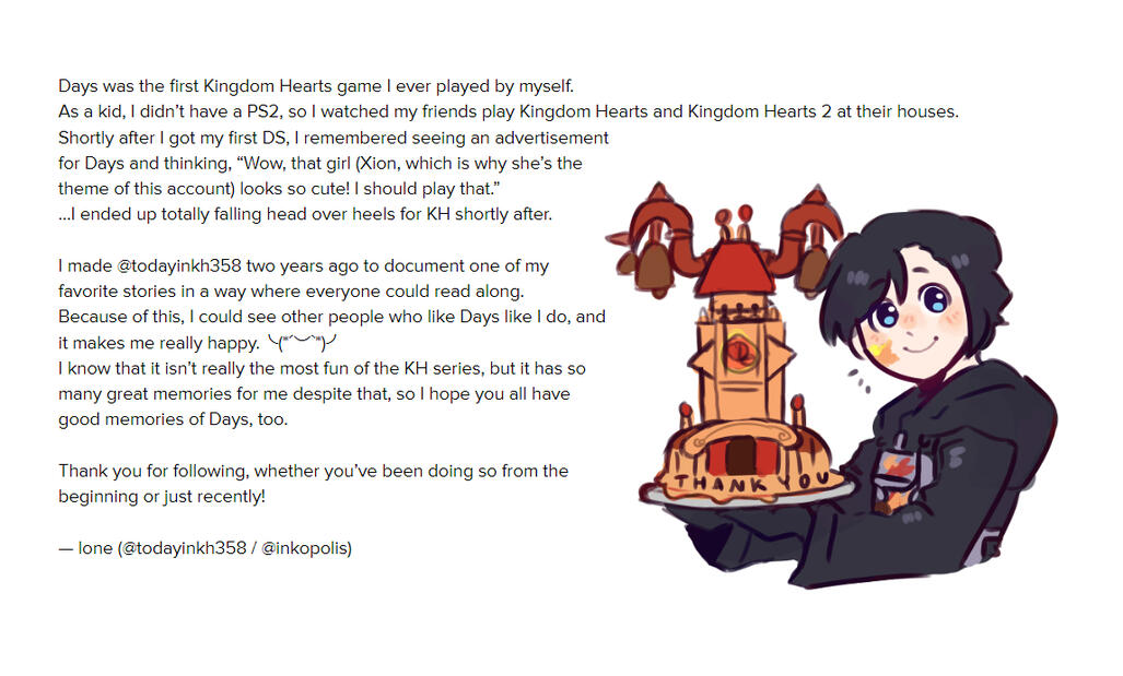i've been running @todayinkh358 for over 5 years!! i'm not much of a kh fan anymore but i still super love 358/2 (one of my favorite games ever) so i don't have any intention of slowing down or anything. but the last game i played was kh3, so i have no clue what happens in the series after that that could retroactively alter kh358/2.